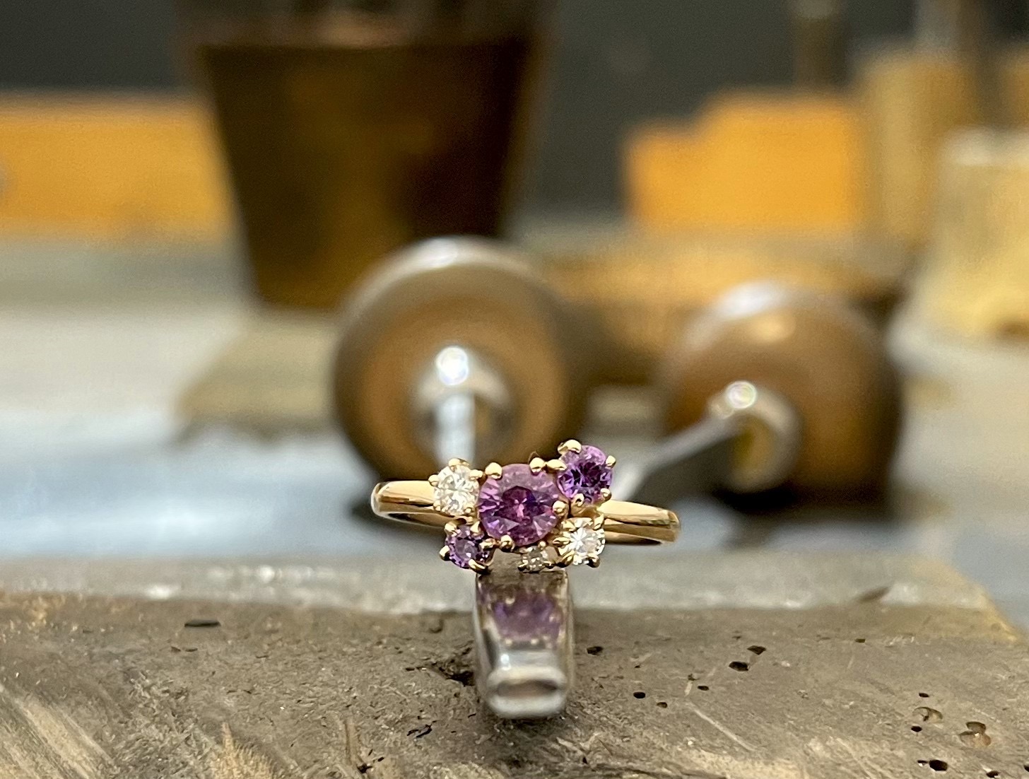 Kun teetät sormuksen, saat juuri sellaisen, kuin haluat, mutta teettämällä voit myös hyväksi käyttää omia koruja. Näin teki Janiitta, joka sai vihkisormukseensa juuri sellaiset kivet, kuin halusi, aseteltuna juuri, kuten hän halusi. Sormuksen timantit on peräisin Janiitan Äidin korviksista, sekä sormuksesta, jonka Isä on joskus Äidille ostanut. Seurakseen timantit sai kolme uljasta kiveä, joita voisi värinsä perustella luulla ametistiksi, mutta ovat kuitenkin safiireja. Safiireihin päädyttiin, koska ne on ametisteja kovempia ja kestävät siten kulutusta paremmin, eli säilyttävät loistonsa pidempään. Sormuksen kiviosa, eli ”kastikka” näyttää siltä, ettei sen viereen toinen sormus istu, mutta kyllähän Janiitan kihlasormukselle paikka järjestyi. Siitä löydät todisteet kuvasta alempaa, jossa sormukset on tyytyväisinä vierekkäin Janiitan sormessa. Äidin sormuksen ja korvisten lisäksi Janiitta kierrätti omia kultakorujaan niin paljon, että rahaa piti käyttää vain murto-osa siitä, mikä oli sormuksen valmistamisen ja kivien hinta-arvio.